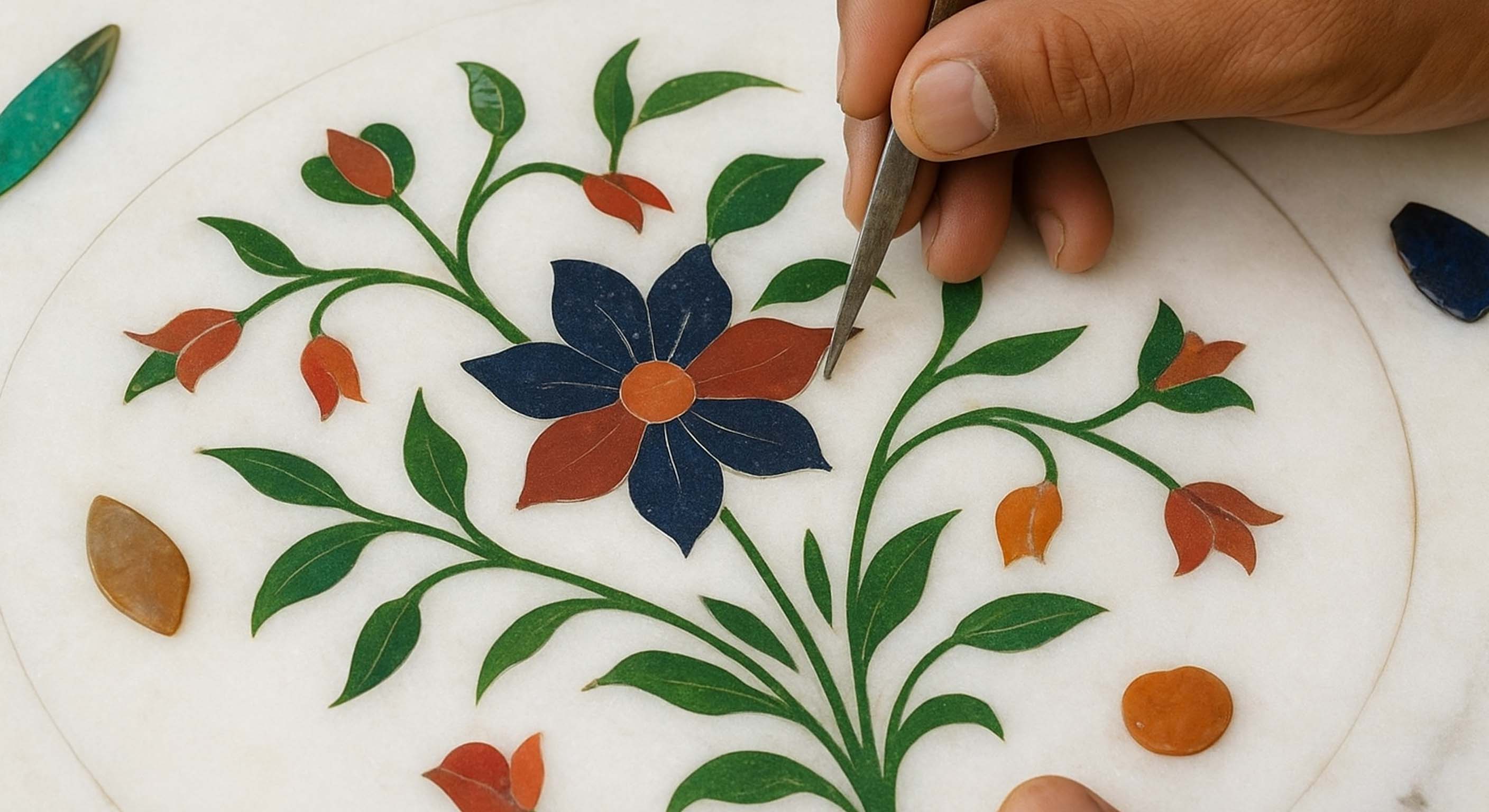 Colored marbles used as both base and inlay pieces (reds, blacks, greens) |