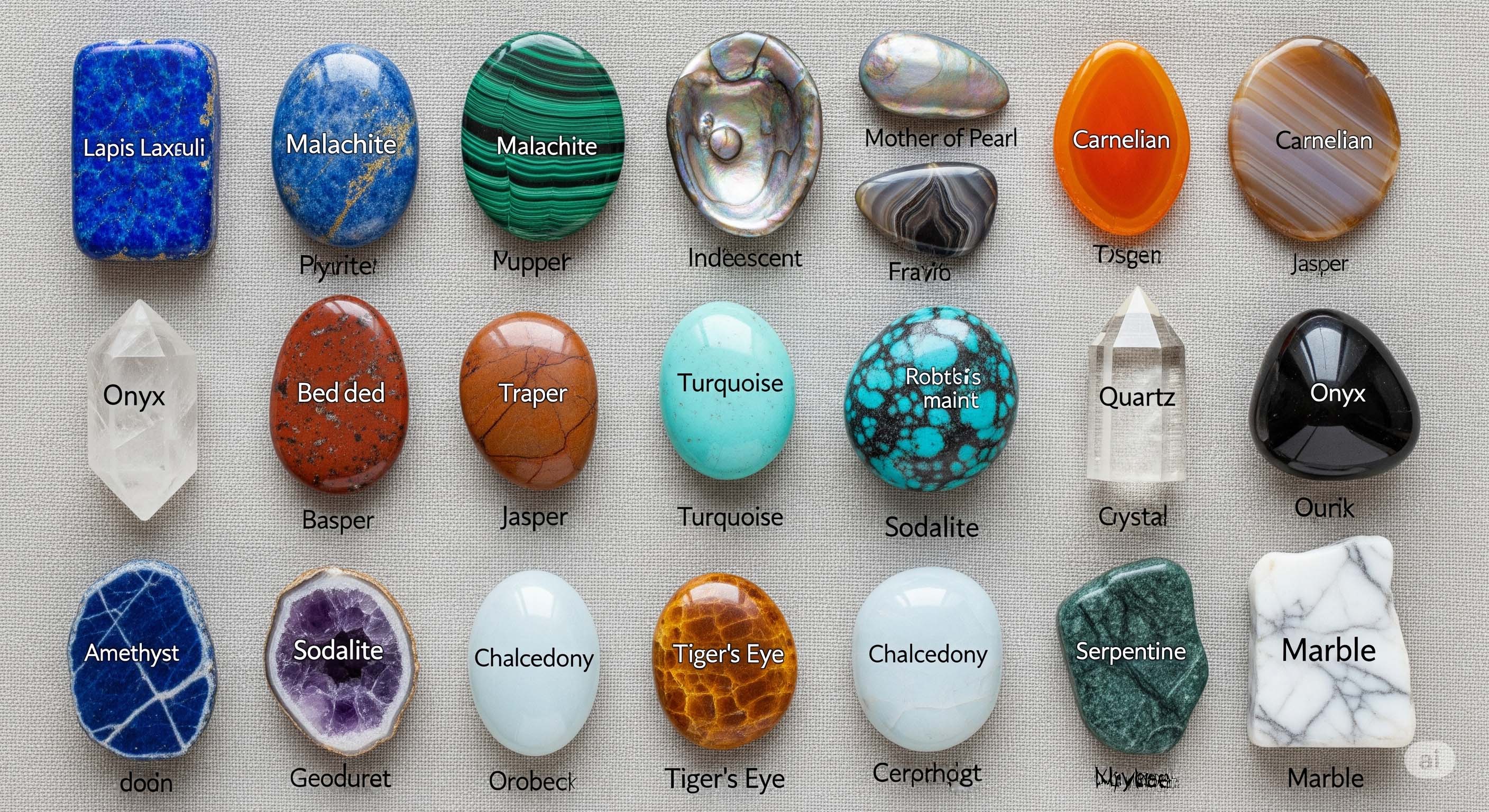 Onyx Pakistan / Iran / some Rajasthan sources Both (often borders) Black or banded onyx for strong outlines and contrast